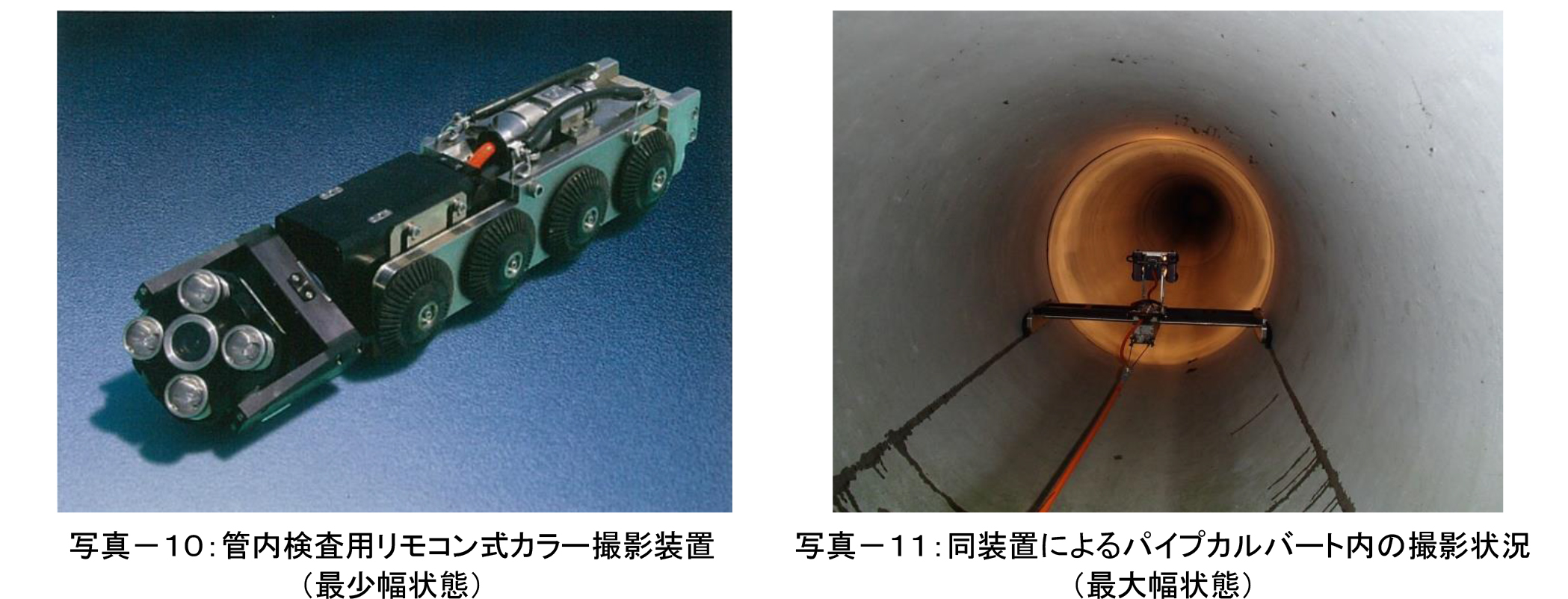 これは高解像度なカメラと照明を自走式装置と一体化し、操作機械と電源のケーブルを接続したもので、人が入って点検することのできない小さい管路や狭小部などの点検を可能としたものである。(写真-10、11)
