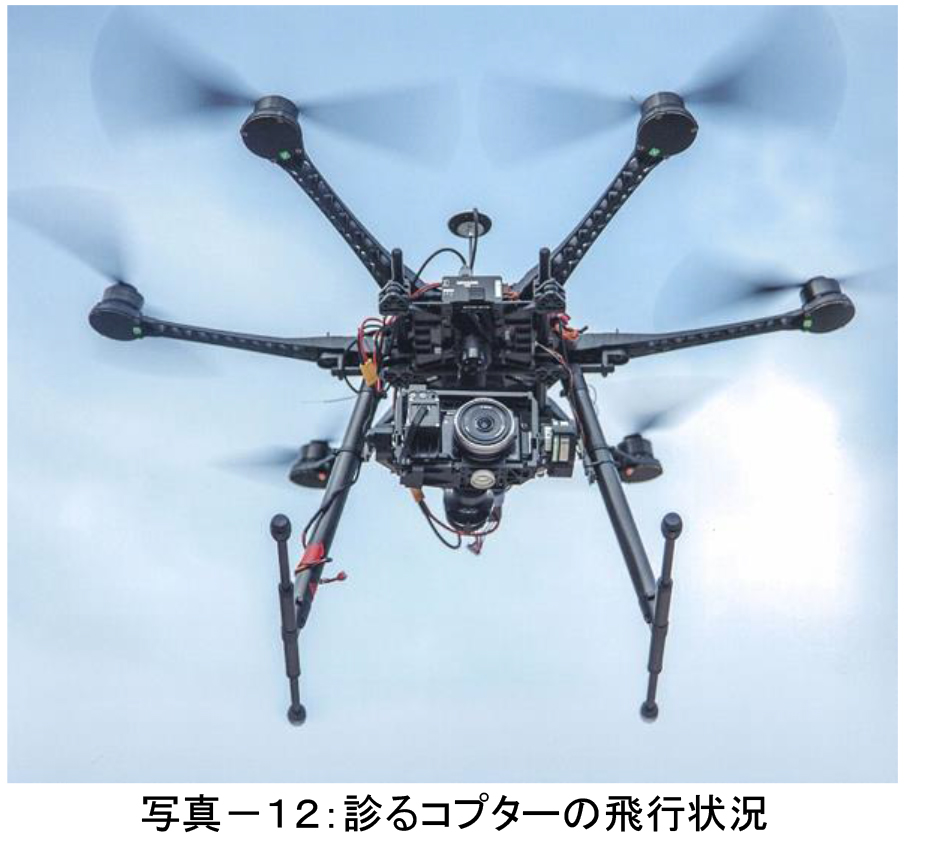 従来の点検手法では近接して見ることのできなかった部位や場所までドローン(無人飛行探査ヘリ)を飛行させ、撮影を行う技術である。これにより、高所作業車や橋梁点検車の利用が困難な場所や災害で近づけない場所の映像取得等が可能となる。(現在のところ重さ6㌔の機器まで搭載可能であり、実用化に向け有効性や利用条件などの検証中である。)(写真-12)