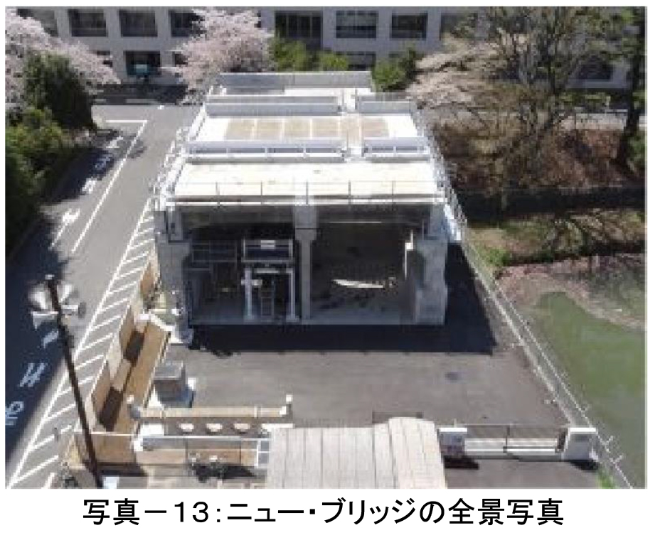ニュー・ブリッジとは、名古屋大学とNEXCO中日本および中日本ハイウェイ・エンジニアリング名古屋(株)が共同で名古屋大学構内に整備した橋梁保全点検技術の研修施設である。具体には、実戦に即した臨床的な橋梁点検研修が行えるように、実際に利用していた橋梁の劣化が進み更新等により撤去された上部構造や部材を全国から集め再構築した設備である。点検技術研修は、NEXCOグループ社員はもとより、一般募集による点検技術研修も実施しており、適切な点検・診断・評価を行うことができる人材育成に取り組んでいる。(写真-13)