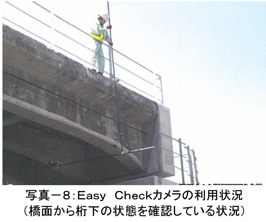 通常では見ることができない高所や狭小箇所の状況を簡単かつ効率的に見ることを目的に開発したもので、軽量なロッドを組み合わせて先端に高解像度カメラを装着し、橋梁下や橋梁上から容易に構造物の状態を見ながら撮影することができる。(写真-8)