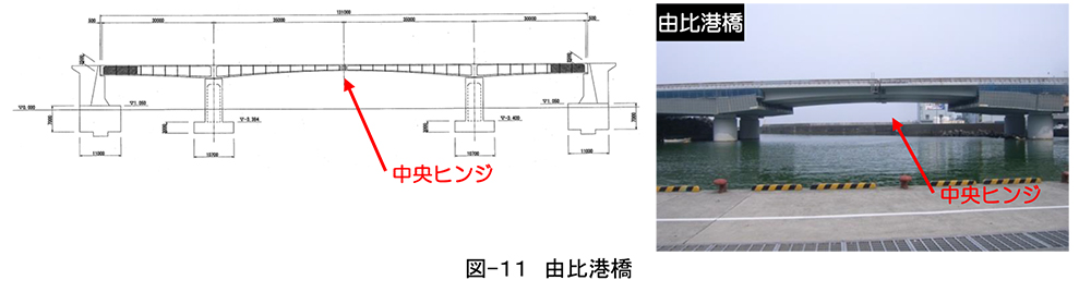 東名高速道路の由比港橋(富士IC~清水JCT)は、中央ヒンジを有するPC箱桁橋である。この中央ヒンジは過去頻繁に損傷が発生しており、これまでも補修してきたが損傷は現在も繰り返し発生している状態にある。また、開通後46年が経過しているためクリープや乾燥収縮によって中央ヒンジが約7㌢垂れ下がっている。(図-11参照)