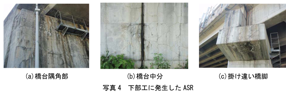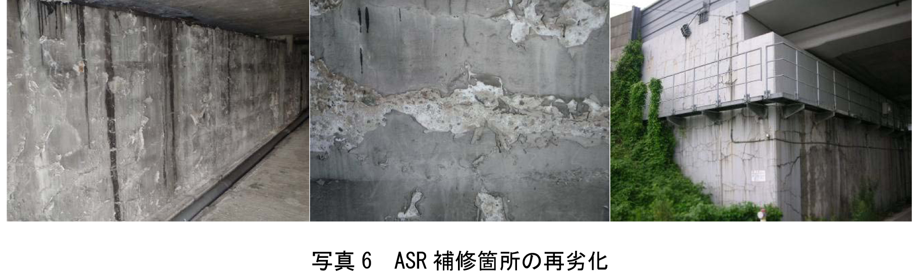 ASRした構造物の補修対策は、ひび割れ注入やコンクリート塗装が一般的である。しかし、ASRした構造物の補修は、ASR膨張と補修実施時期のタイミングで写真6のような再劣化がみられるため、ASR膨張が収束した構造物は、構造物の長寿命化を図るためひび割れ注入やコンクリート塗装による補修を計画的に実施している。またASR膨張が収束していない構造物は、第三者被害を防止する観点からはく落対策として連続繊維シートの貼付けによる補修を計画的に実施している。