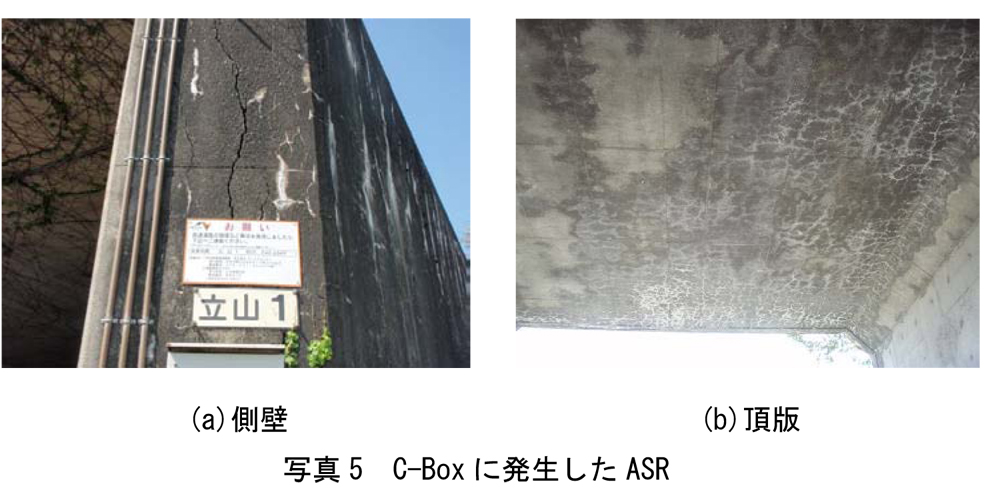 また、平成20年度から平成23年度にかけて、NEXCO金沢支社と金沢大学とによる「ASRコンクリート構造物の合理的な維持管理手法の確立に関する共同研究」が行われた。本研究では、約10年前に実施した促進養生試験(カナダ法およびデンマーク法)や薄片観察を実施した構造物からコアを採取し、同様な試験を行うことでASRの進行状況を確認するとともにEPMAによりアルカリシリカゲルの成分を分析することでASR残存膨張性の傾向を見出すものであった。この結果、富山県で多く使用されている常願寺川水系や神通川水系の砂利を使用した構造物はASR膨張が収束していないのに対して、福井県で主に使用されている九頭竜川水系の砂利を使用した構造物はASR膨張が収束していると判断した。金沢支社管内におけるASRは以下のような特徴がある。