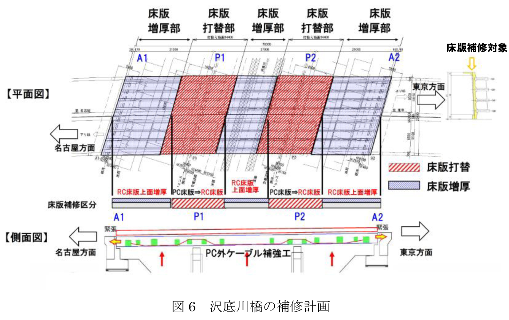 工事については、中間支点上の床版更新と支間中央部の床版補修を組み合わせたもので、PC連続合成桁橋として、床版更新と外ケーブルによるPC桁補強の併用工法は、国内初の取り組み事例となります。