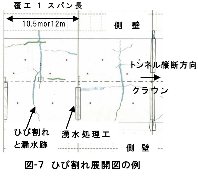 これらの作業には、現在の変状状態が記録されている覆工クラックの展開図が基本となる。ひび割れは、詳細点検として5年に一度の頻度で目視と打音による結果をひび割れ展開図(図-7参照)に「ひび割れの幅、長さ、位置や形態」などの情報が、「湧水の状況」、「対策工の履歴」の情報とともに記録されている。また、5年毎のひび割れの状況を比較することでひび割れ