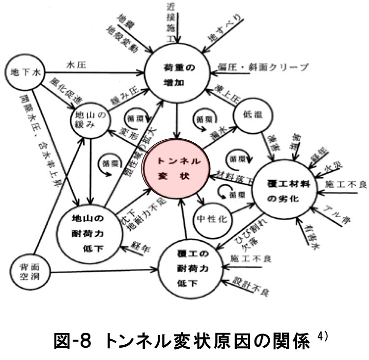 トンネルは掘削し空間を造ることで、地山は緩み岩盤の亀裂は開き、地下水に導水勾配が生じる。そして地下水の浸透を受け劣化が始まり、時間の経過とともに劣化と強度の低下が進み地山の変位がトンネルに変状として現れてくる。図-63)