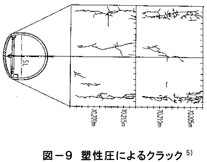 筆者の経験から、覆工に生じている現象の原因推定に関して、明らかな外力が作用する場合には特徴のあるひび割れパターンが生じる。図-95)は、塑性圧による変状の中でも横方向の力が卓越し側壁部付近の縦断方向に開口したひび割れが生じた状況を示している。このような例は、原因が特定しやすいが、風化や強度の低下が緩やかな場合には、特徴的なひび割れが生じるまでの長い間に、次に述べる初期の欠陥によりひび割れの生じ易い個所に沿って覆工にひび割れが生じる傾向があり、原因推定を難しくすると推測している。