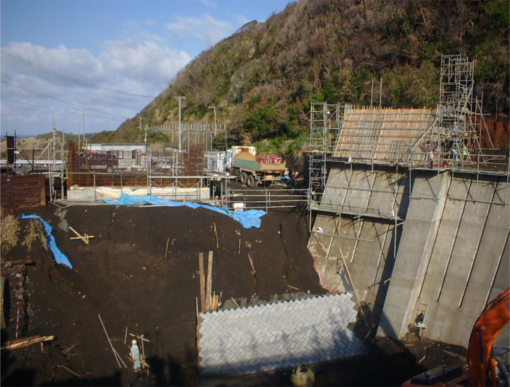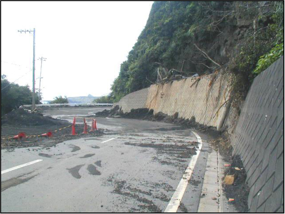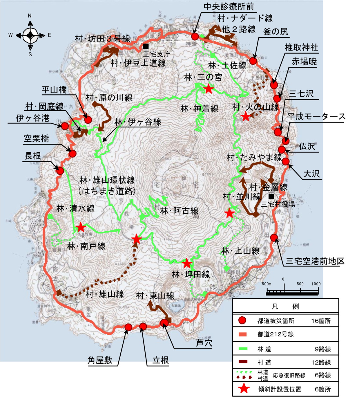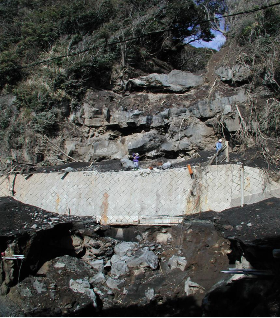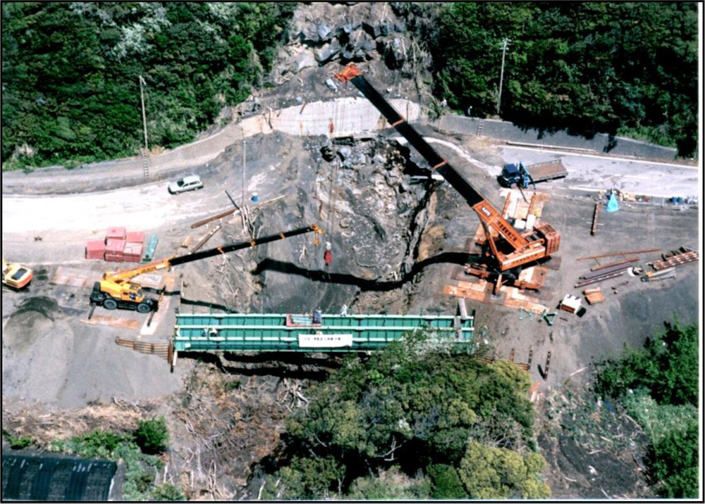 紹介するのは、2002年(平成12年)6月26日に、三宅島・雄山付近の火山活動(左写真-2) が活発化したことから三宅島緊急火山情報が気象庁より発表され、同年9月2日に全島民避難した後に行った災害復旧事業の話である。 三宅島は、東京から南南西約180kmの海上に浮かぶ直径約8㎞のほぼ円形をした伊豆諸島のなかでは3番目に大きい島である。三宅島は、海底部分も含めると直径20~25km程度のやや南北に伸びた円錐形の玄武岩質海底火山が成長し、山頂部が海上に出た島であり、海岸には急な崖が少ないこと、波の浸食をあまり受けていない若い火山島である。現在の三宅島の骨格を形成したのは、約3,000年前のことと予測され、標高1,000m級の成層火山が、割れ目噴火で溶岩を大量に噴出し、直後に雄山の山頂部で大規模の陥没が発生し、直径3.5kmの外輪山(桑木平カルデラ)が形成されたようである。三宅島は、2002年の噴火及びその後に発生した火山泥流によって島の多くの道路が被災したが、私の記憶に残る異様な作業環境、二度と経験することのない有毒火山ガスとの戦いであった。 さて、仮橋設置の話に戻すことにしよう。図-3にも示すように三宅島を周回する東京都が管理する道路としては、三宅環状線(第212号)のほか2路線があり、島のメインとなるのは海岸沿いの延長約32.88kmの周回道路である。周回道路の被災箇所は,軽微な箇所を含めると20数箇所にも及んだが、火山の噴火によって被災したのは、数箇所であり、ほとんどは、泥流による被災であった。雄山の噴火によって、三宅島の山頂付近には1mを越える火山灰が積もったことから、雨が降るたびに火山灰と水が混じり合って流下、堆積したスコリアを巻き込み、大量の土石流となって山麓へと移動した。移動する土石流は、渓流の底や側面を大規模にガリ侵食し、斜度が10°を下回ると堆積し始め、最終的に海へ流下するか、斜度が2°を下回る平地においで、扇状的に広がり堆積した。