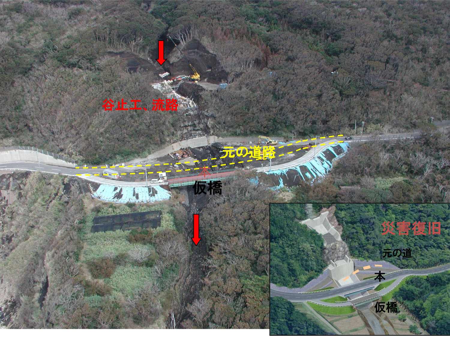 当時の先輩方は、「髙木君、良かったね。道路を橋で復旧することは今まで無かったし、大きな足跡を残せたね」と言って褒めてはくれたが、自分の中では「失敗した。チャンスを物にできなかった。」後悔の念が一杯であった。余談ではあるが、災害査定、朱入れ作業を経て災害復旧事業費が確定した後に、建設省(現国土交通省)の査定官と大蔵省(現財務省)の立会官(りっかいかんと呼ぶ、知らないでたちあいかんと呼ぶと激怒されるから要注意である)に仮橋設置位置と復旧について聞いたところ、「髙木さんが言うとおりですが、だからと言って図の青色線の地点まで本橋を離すことはまあ限り無く無理です。災害復旧として妥当なのは、仮橋が設置してある箇所でしょう。まあ、黄色線も可能な場合もありますが、これにはかなりの説明作業が伴うでしょう」とのことであった。災害査定のプロになるにはかなりの経験と関連する知識が必要と感じた瞬間であった。 次に、その経験を活かした三宅島での災害復旧における仮橋設置位置決定と道路線形改良事業について述べることとする。