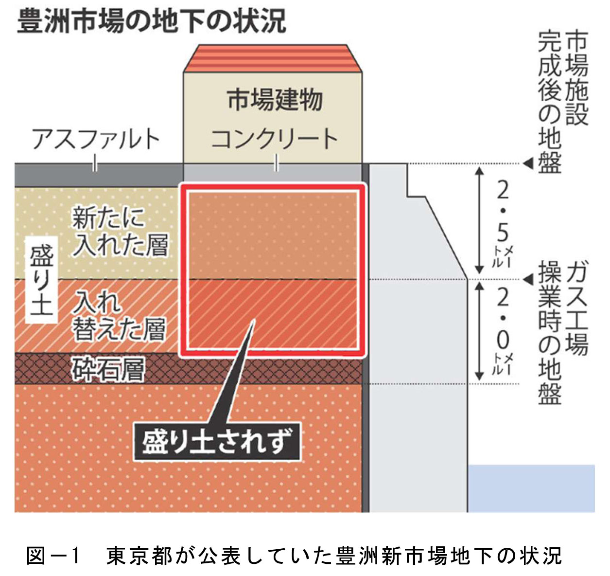 今回の豊洲への移転に関する重要な問題は、土壌汚染対策である。一般的な土壌汚染対策の考え方を示すと土は大気、水と並んで環境を左右する主要な要素である。大気や水と比較すると土壌汚染には、以下の特徴がある。①人が関係する諸活動は、土が何らかの生態学的な結びつきを持っている。人の生物的活動にも関係を持つ土壌汚染は、原材料の漏出や廃棄物の処分によって直接的に汚染されることによって起こる。さらに、土壌が汚染することは、大気汚染や水質汚濁の結果として間接的に汚染する場ともなる。②土の組成は、水や大気と比較すると複雑であることから、有害物質を保持する容量が極めて高い。また、土に混入した有害物質は、長く続く大気や水の汚染源となる可能性が高い。③土壌汚染の特徴として汚染の範囲が狭く、局地的な環境条件の影響を受けやすく、土は大気や水と比較して移動性が小さく空間的な混合や平均化を受けにくいため、汚染された位置によっては汚染の程度が著しく変動する。④土壌汚染の有害物質の多くは土に安定的に保持されるために、一度汚染すると有害物質の地層への排出や負荷の状態が改善されてもその影響が長期化しやすい。ここに示すような特徴を持つ土壌汚染は、大気汚染や水質汚濁と比較して、より抜本的で総合的な対策が必要となるのが一般的である。特に今回のような人工化学物質による汚染の場合は、汚染土壌の一部入れ替えやその上に盛り土対策を行ったとしても、何らかの方法によって常に関連する土壌の状態を確認することが必要となる。今回各市場棟の下に空間を設置したことは別にして、土壌汚染物質の広がりや汚染対策の効果を確認するモニタリング空間を持つことは常識なのである。私は、今回の問題に関連している行政技術者は、自分の考え行った施策に対して自信を持ってなぜ説明ができないのか、厳しい周囲の状況は分かるが非常に歯がゆい思いなのである。