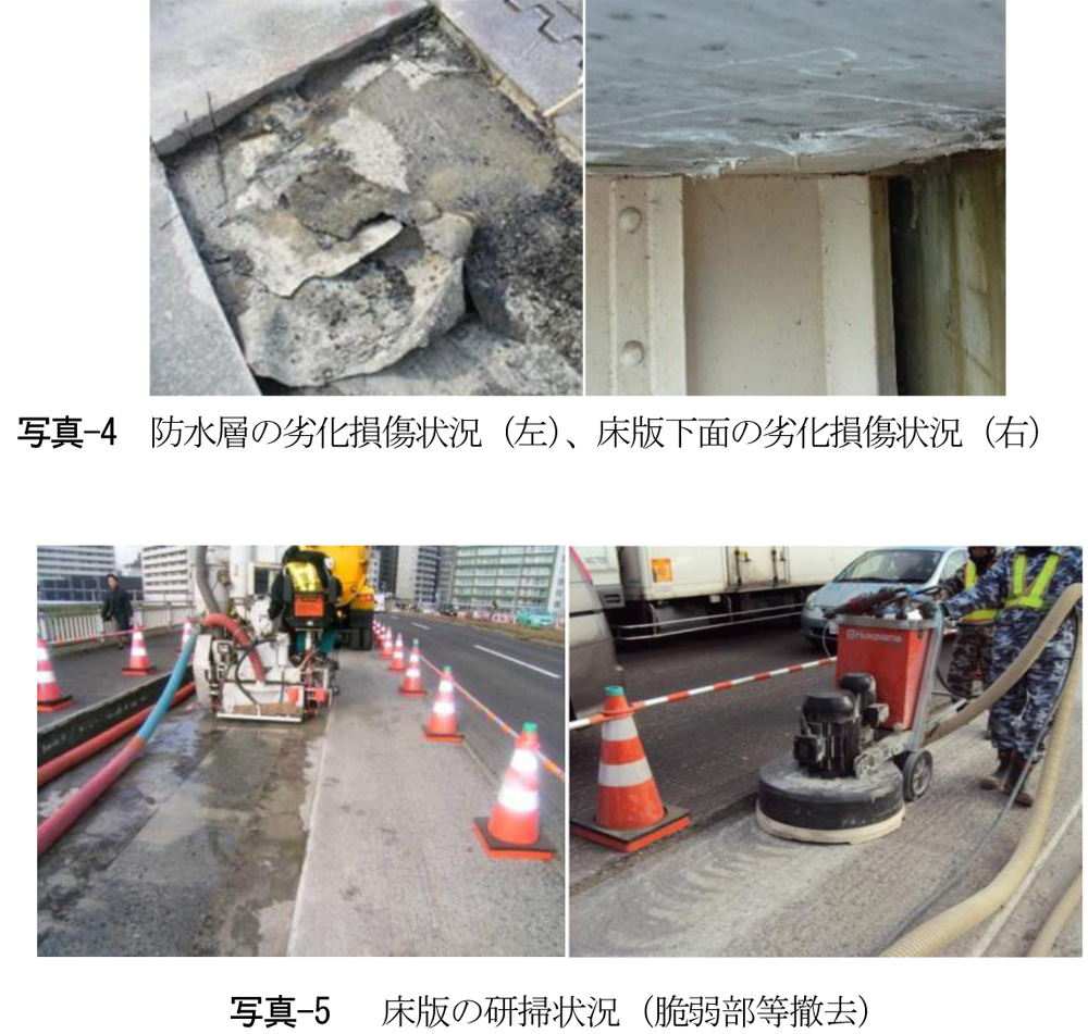 新設時において床版上面に塵、埃、ノロおよびレイタンス等が残っていると、防水層との付着に悪影響を与える。既設においても床版上面に凍害等で劣化損傷した脆弱部がある場合、母材コンクリートが破壊後はく離し、防水層の機能が喪失することがあるため研掃装置等により適切に除去する(写真-5)。