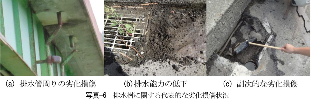 排水桝の劣化損傷状況を把握し、現状の排水桝が有する問題点を明確にするために、北海道内の国道橋に関する点検結果を整理した。写真-6は代表的な劣化損傷状況を示したものである。排水桝に関連する劣化損傷は次の3つに大別される。