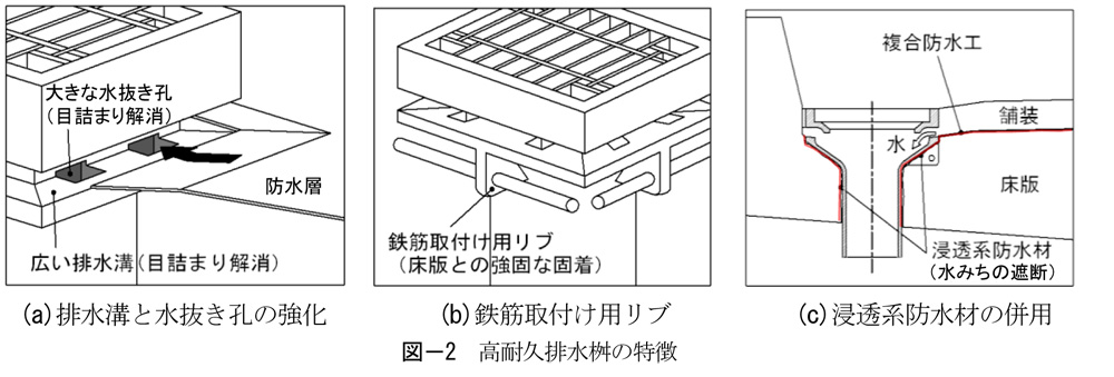 排水桝と床版の一体性の向上を目的に、図-2(b)のように鉄筋取付け用リブを設け、定着用の鉄筋を介して床版と排水桝の定着を強化する構造とした。