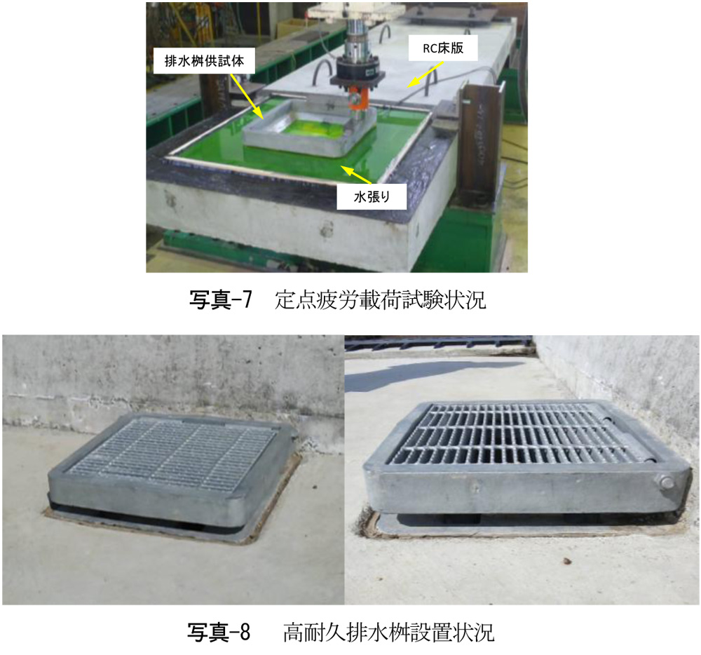 載荷方法は定点疲労載荷とし、車両走行時に輪荷重が直接に排水桝へ載荷された場合等も想定した。試験終了後に実施した浸透探傷試験の結果、排水桝に疲労亀裂は認められず健全な状態であった。また、床版下面において排水管周辺からも漏水は認められず、排水桝と床版との一体性が確保されていた。