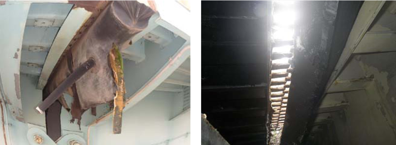 伸縮継手部の損傷のうち最も多く見られる損傷は、継手遊間部の樋やバックアップ材の損傷・脱落である(図11)。これは直ちに桁端部の漏水につながり、上述したような鋼部材の腐食をはじめ様々な問題を引き起こすこととなる。
