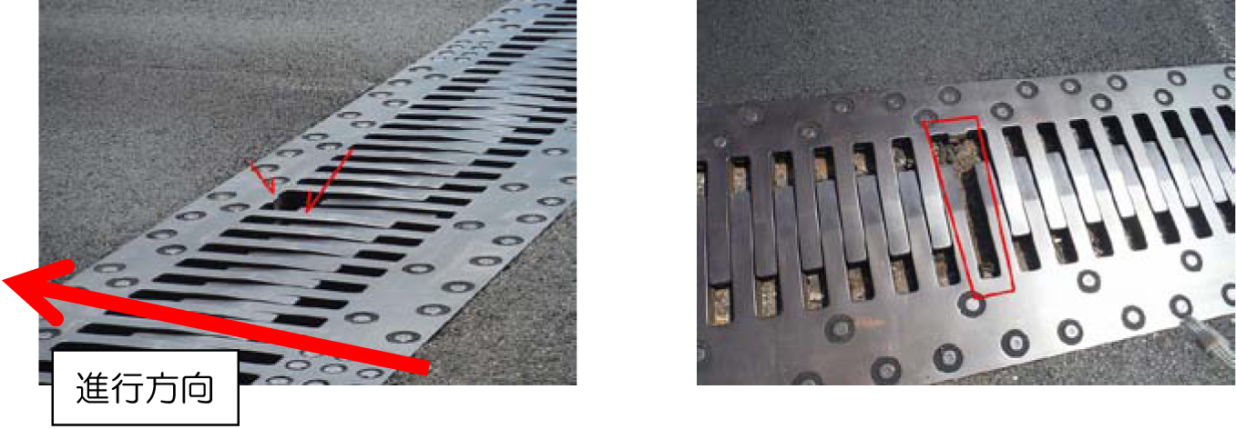 また、近年増えてきた事例として、伸縮継手フィンガーの折損がある(図14)。フィンガーは、いずれもフランジ接触端よりやや付根側で破断していた。破面は平坦で、顕著な変形はないことなどから、路面側を起点とする疲労損傷と考えられる。土砂等の堆積等によりフィンガーの先端が浮き上がった状態となった場合、車両通行によりのフィンガー先端部に負荷がかかり、その付根近傍に想定以上の曲げ応力が作用する。これが繰り返され疲労亀裂が発生したと推測される。また、フィンガー下面では腐食による減肉が認められたものもあり、これも疲労損傷を助長していると考えられる。ただし、フィンガー下面においても亀裂の発生が認められたものもあり、損傷メカニズムについてはさらなる検討が必要と考える。