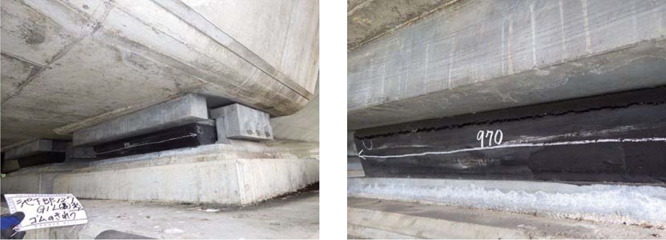 平成7年の兵庫県南部地震以降、阪神高速ではゴム支承の採用が標準となった。平成9年竣工の反力分散型ゴム支承において、平成19年にオゾンクラックと思われる亀裂が見つかった(図15)。平成22~23年にかけて、機能上の問題があると判断された箇所は、亀裂を除去後、加硫補修を行い、機能上の問題がないと判断された箇所にはオゾンクラックの予防に対して保護するコーティング剤(HBコート)塗布による補修を行った。その後、平成27年の点検においてコーティング材塗布箇所においてもきれつ長の伸展が確認されたものが一部見つかったため、平成28年に程度の悪いものは加硫補修、そうでないものは再度コーティング材塗布を行った。