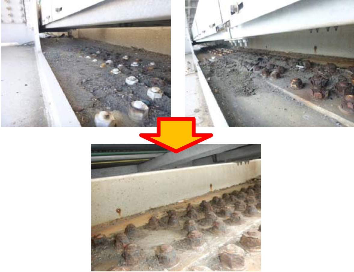 斜張橋やアーチ橋等で主構が路面の外側に位置する箇所においては、主構上にゴミや土砂等、路面からの飛来物が堆積するケースもあり、主構の断面形状によっては問題を引き起こすケースもある。図17に斜張橋主桁トラス弦材上の土砂堆積と、土砂除去後に発見されたボルトの腐食状況を示す。当該箇所は通常の路面清掃の範囲外であり、弦材がH型断面であることもあって土砂が堆積しやすいことから、当面は当該箇所の清掃頻度を上げて土砂堆積を防ぐことで対応していくものとする。