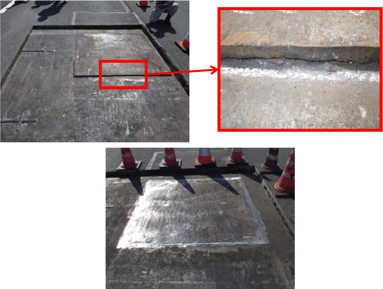 FC船による一括架設を行った鋼床版箱桁橋で、鋼床版上の保護を目的としたと思われるセッティングビームあて板がデッキ上に隅肉溶接で設置され、架設後も撤去されずにそのまま舗装されていた。供用後20年を経てあて板の隅肉溶接部が割れ、挙動したことで舗装に損傷が生じ、補修のため舗装を撤去したところで明らかになったものである(図18)。周辺の舗装を除去後、あて板を撤去し再舗装して補修完了とした。また、類似の箇所も調査し、舗装に異常が見られる箇所については同様の対応をした。