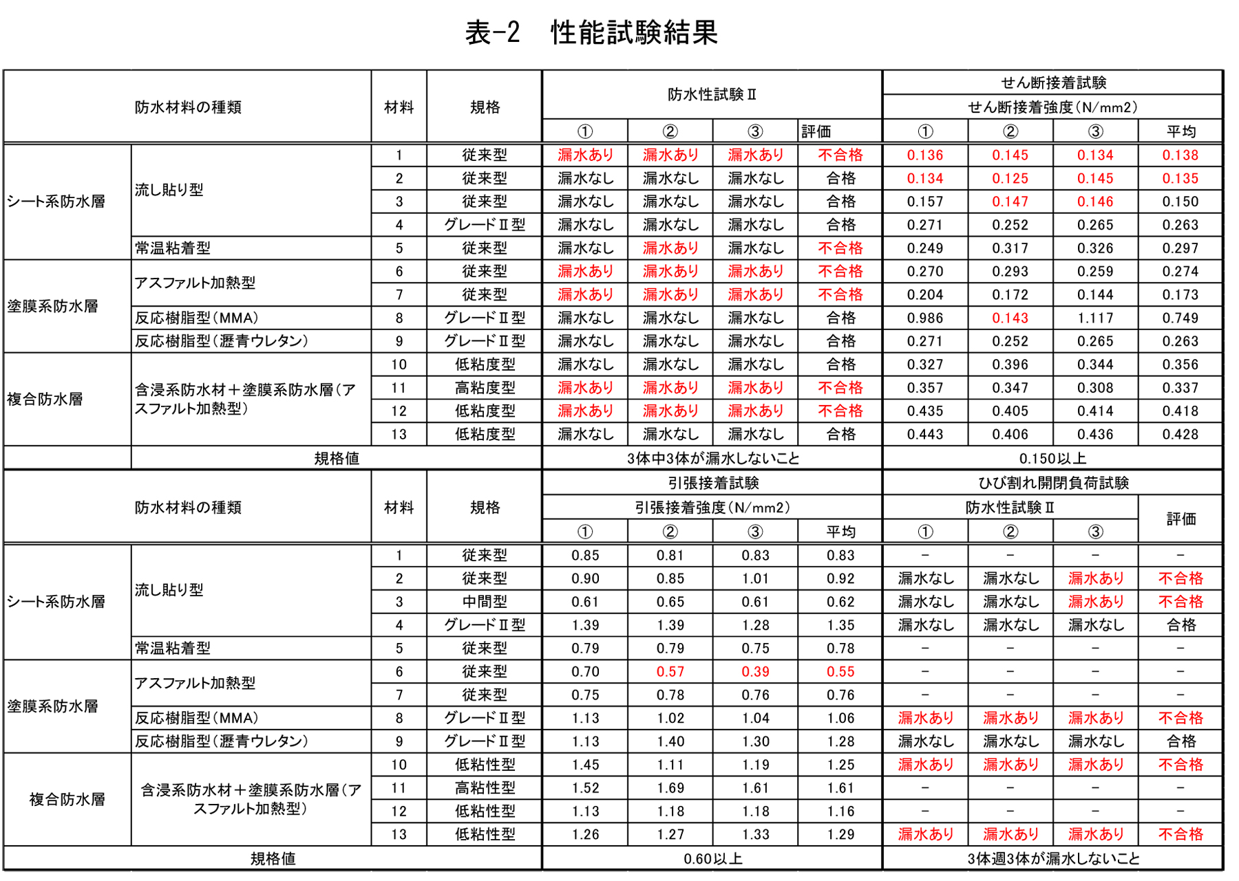 各材料3体ずつ試験を行い、すべての試験体で漏水しない場合を合格、1体以上漏水した場合を不合格と照査した。グレードⅡ型のすべての材料、従来型のシート系防水層の一部材料、低粘度型の複合防水層の一部材料が合格と判断できる結果となった。