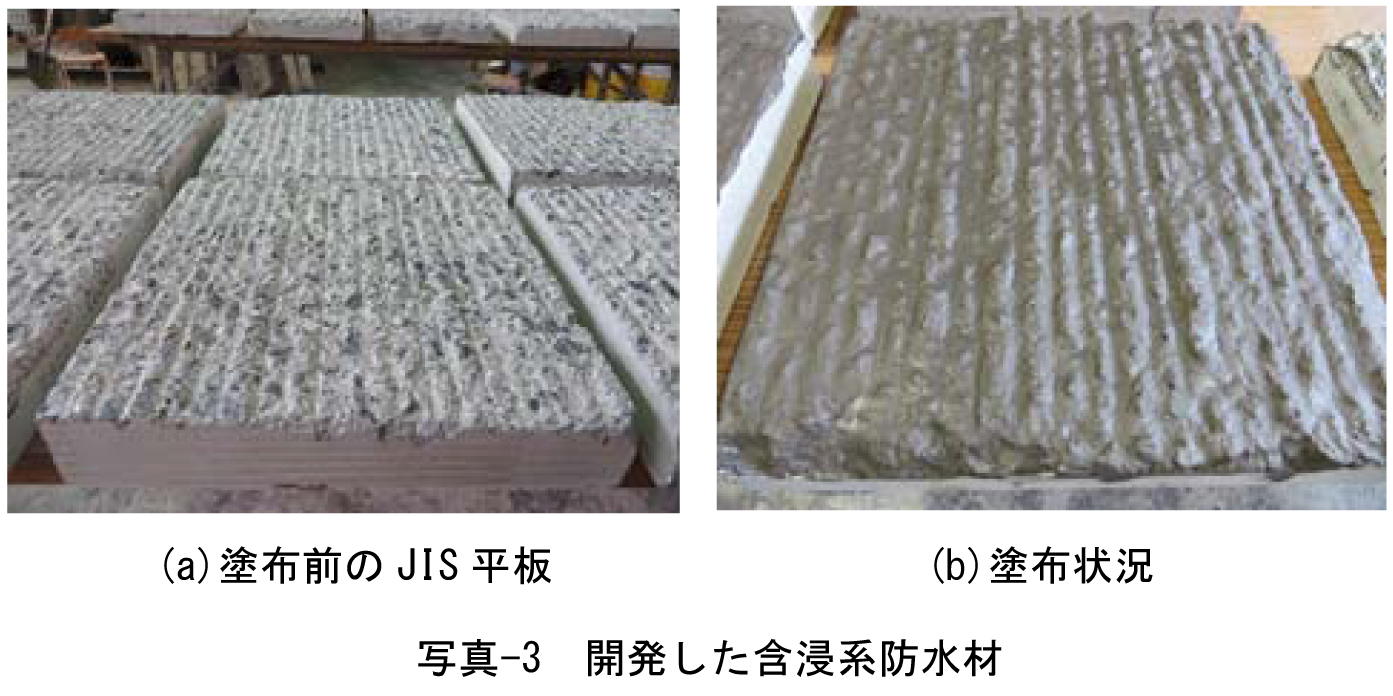 阪神高速道路では、含浸系防水材と塗膜系防水層(アスファルト加熱型)を組み合わせた複合防水層の開発に取り組んでいる。本開発では、低粘度(10~15MPa・s/5℃~20℃)の水性エポキシ樹脂を主成分とする含浸系防水材に着目し、特に比較的大きなひび割れ(0.1mm以上)への充填性の向上と、切削面の凹凸を滑らかにすることでの塗膜系防水層の品質向上を期待して、水性エポキシ樹脂にセメント系紛体を混合した含浸系防水材を開発した。切削したJIS平板に含浸系防水材を塗布した例を写真-3に示す。