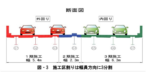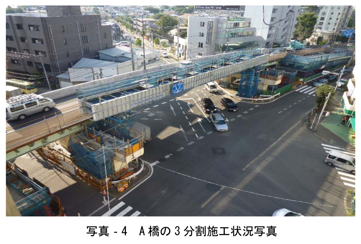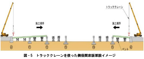 れた。市街地の跨道橋、それも12時間交通量が4万台を超える状況下での工事である。図-3に示すように施工区割りは幅員方向に3分割し、上りと下り各1車線及び側道分部の通行機能を確保する条件下で行われた。中央径間の鋼床版桁の架設は、西側から東側に向かって3分割施工とし、比較的広い作業帯が確保できる第Ⅰ期と第Ⅲ期については図-4に示すように架設桁を使った既存桁撤去及び架設、中央部の狭小作業帯となる第Ⅱ期は門型クレーンによる架設とした。また、側径間は、跨道部でないことから図-5に示すようにトラッククレーンによる鋼床版架設を採用した。既設桁の撤去、新規桁の架設を狭隘な空間で事故なく安全に行うために、部材吊り上げ能力に細心の注意を払い、主径間区域の3径間を橋軸方向に9分割、橋軸直角方向に5分割、合計45ブロックに分割する施工となった。