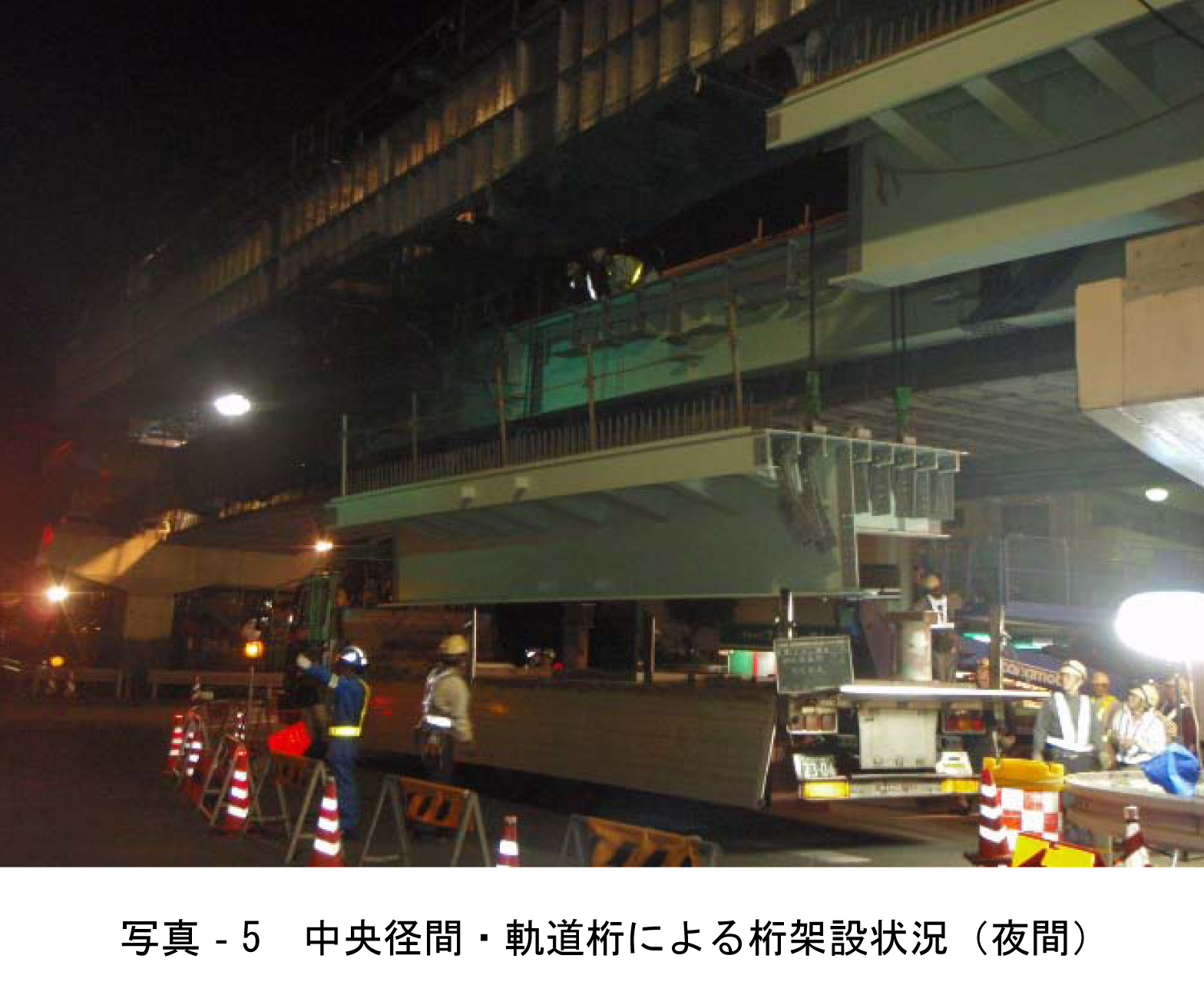 なお、側径間の疲労亀裂発生箇所の補修は、溶接ディテールの改善で十分との判断から、亀裂発生箇所の溶接ビード部をグラインダー等によって除去、半自動CO2溶接で成形・再溶接を行っている。写真-4にA橋の施工状況を鳥瞰的に、そして写真-5に交通量の少ない夜間に行われた中央径間桁架設状況を示した。以上がA橋の補強施工概要である。