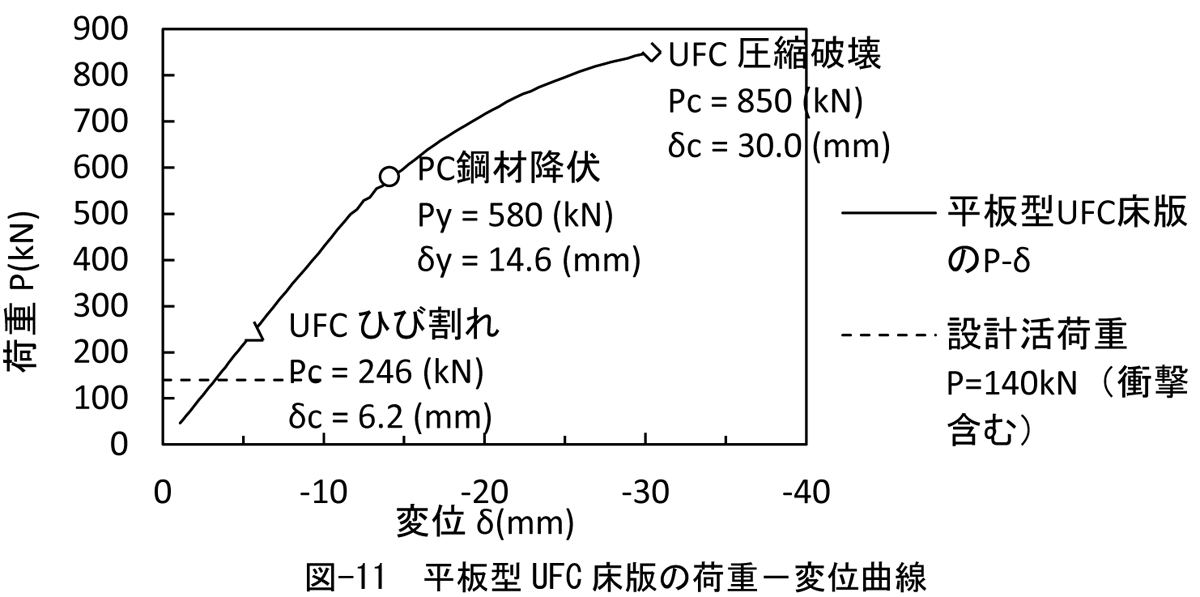 平板型UFC床版の断面破壊に対する安全性を確認するために、床版厚さ150mm(床版支間長4.0m)に対し、非線形3次元FEM解析を実施した6)。載荷荷重は死荷重およびプレストレス力を考慮し、床版中央に輪荷重を想定した分布荷重(200×500mm)を漸増載荷した。解析結果として荷重-変位曲線を図-10に示す。漸増解析結果によると、UFCひび割れ時の荷重は設計T荷重140kN(衝撃係数0.4)の1.75倍、PC鋼材降伏時荷重は4.14倍、UFC圧縮破壊時荷重は6.07倍であり、断面破壊に対する十分な安全性を有しているといえる。