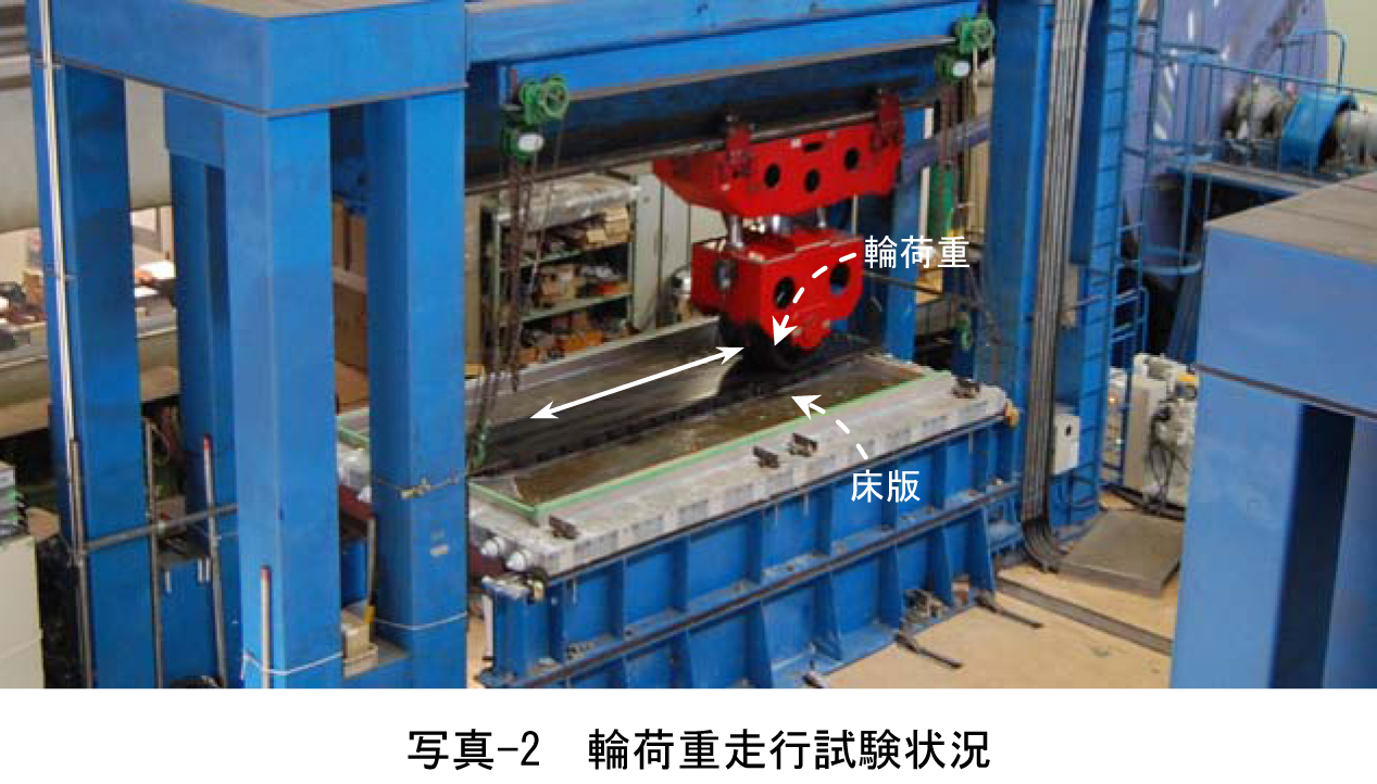 平板型UFC床版の疲労耐久性は、輪荷重走行試験によって確認した。輪荷重走行試験については、鉄輪による動的な輪荷重載荷とした。載荷荷重は100kNから30kNずつ加算し最大400kNまでの階段状載荷とし、各載荷段階で4万回ずつ合計40万回載荷した。なお、100kN~160kNの12万回については、床版上に水のある状態で載荷した。この載荷ステップは、既往のRC床版などの輪荷重走行試験を参考に決定したが、阪神高速における実測活荷重に対して100年に相当する等価繰返し回数を大きく上回るものである。輪荷重走行試験の状況を写真-2に示す。