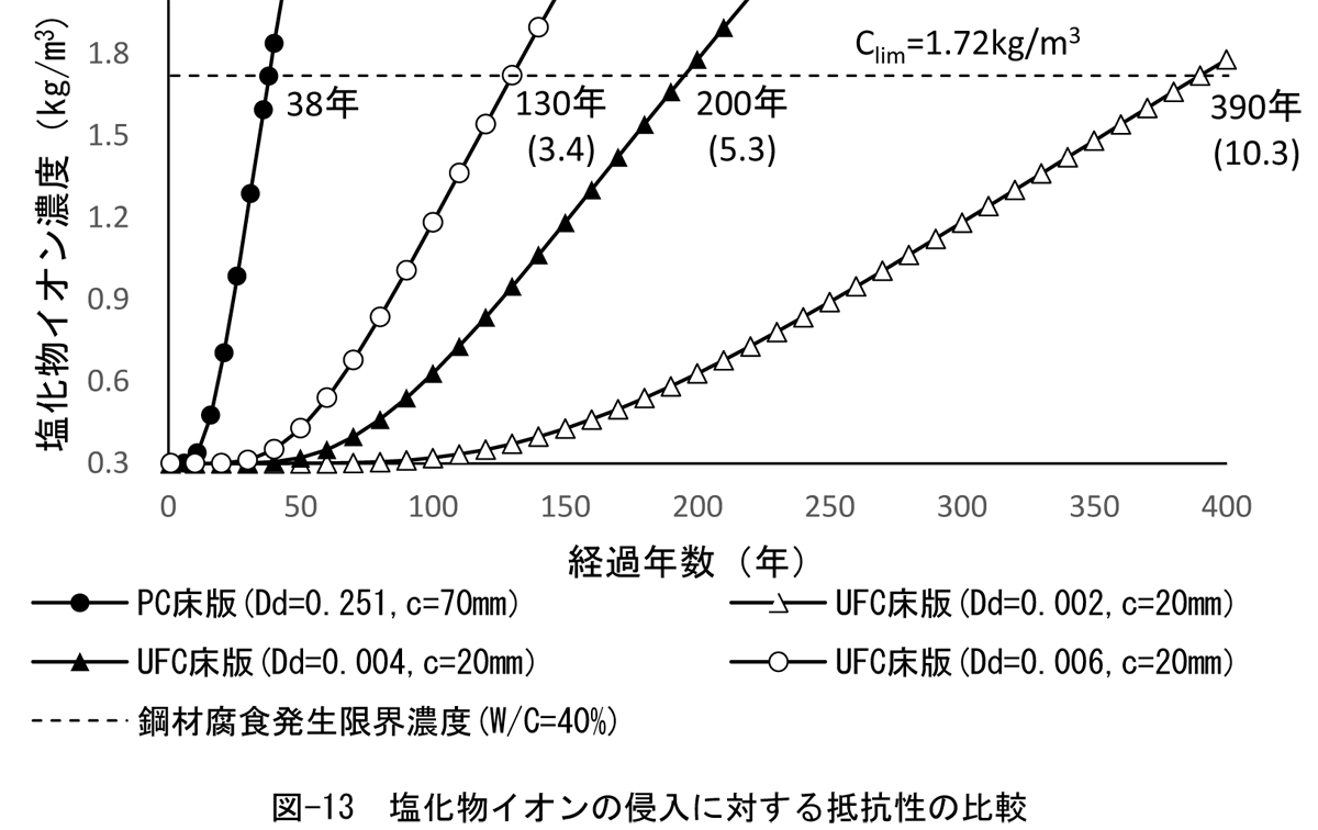 耐久性の比較としてPC床版、UFC床版の鋼材位置における塩化物イオン濃度の算出結果の比較を図-13に示す。塩化物イオン濃度はコンクリート標準示方書8)に準じて算出した。表面塩化物イオン濃度として13.0kg/m3(飛沫帯)を想定し、かぶりをPC床版は70mm、UFC床版は20mmとした。塩化物イオン拡散係数DdはPC床版を0.251、UFC床版を0.002~0.006(AFt系UFCの実測値は0.002)として計算した。鋼材の腐食発生限界に達する年数はPC床版に比べて約3~10倍長く、高い耐久性を有していることから凍結防止剤等の高頻度地域では特に有効といえる。