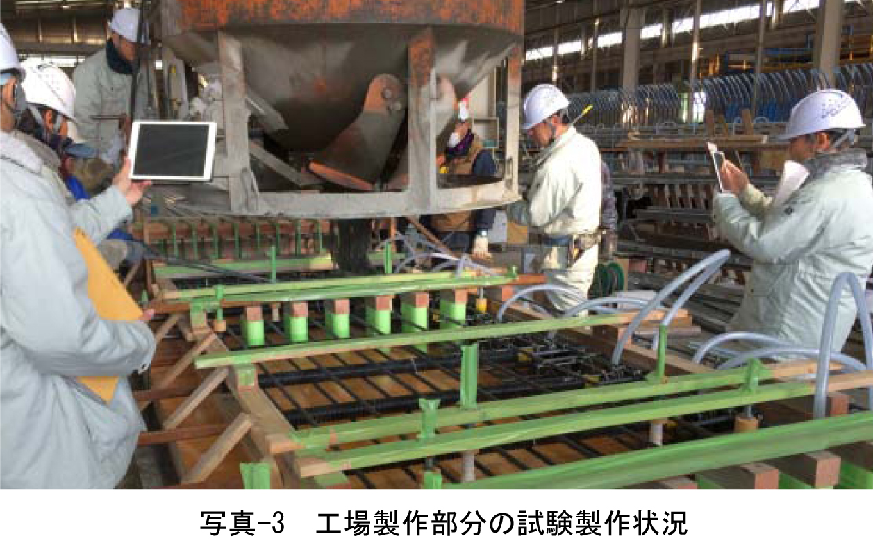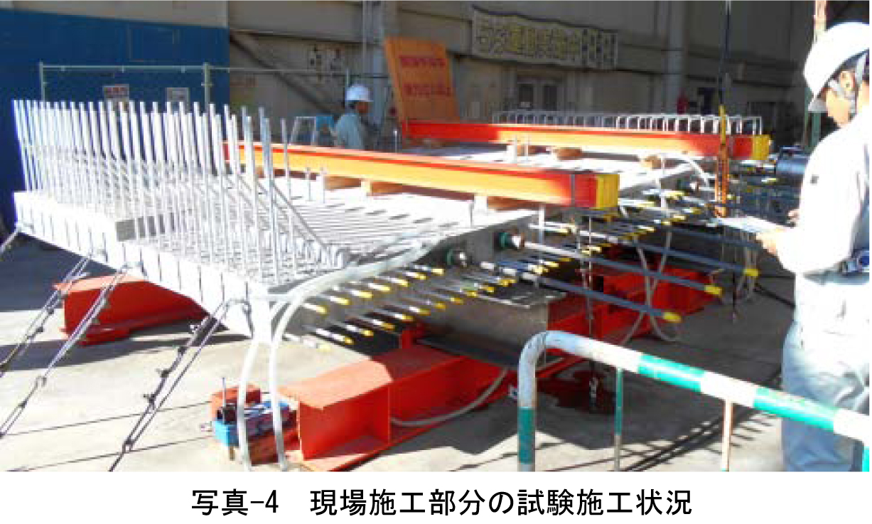 工場製作のプレキャスト部と現場施工の場所打ち部の接合構造として、伸縮装置部、壁高欄接合部,排水桝取り付け部の施工性を検討して、写真-3のように、工場製作部分の試験製作を実施し、提案する詳細構造の製作性に問題が無いことを確認し、出来形確認時に地覆等の鉄筋埋め込み部について、鉄筋の拘束によるUFCのひび割れが生じていないことを確認した。また、現場施工部分についても写真-4のように試験施工を実施した。スタッド孔における溶接施工時の施工空間や、モルタル充填に対する流動性の影響等の知見が得られたため、実施工時に反映したいと考えている。