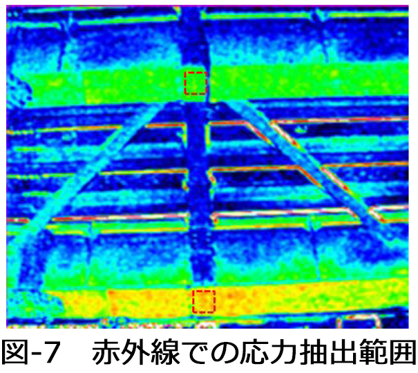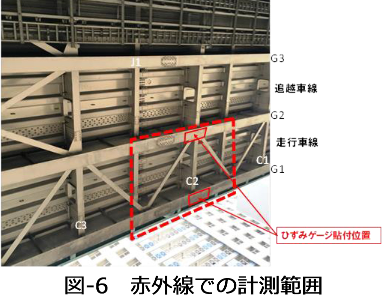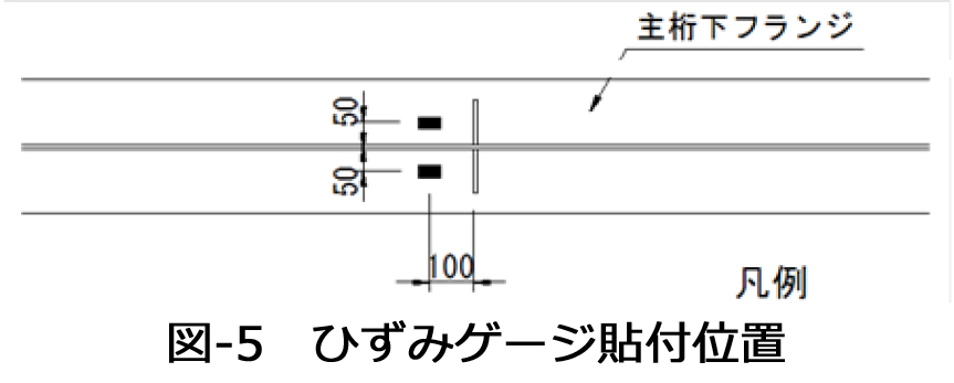 ひずみゲージは橋軸直角曲げの影響を考慮し、図-5のように主桁下フランジ下面に1軸ゲージを左右2箇所に塗膜を除去した後に貼り付け、応力振幅は2箇所の平均値を用いて算出した。また、赤外線カメラはひずみゲージ貼り付け位置がカメラの視野内に入るよう図-6に示す赤点線枠内を路下から測定し、応力振幅は図-7にて赤点線枠で示される領域のピクセルの平均値とした。