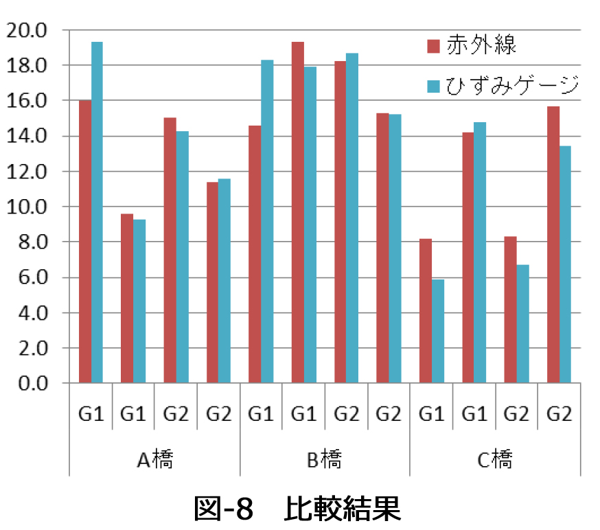 本システムとひずみゲージの比較結果を図-8に示す。比較は試験車以外の通行車両の影響を受けていない12ケースで行った。この結果、ひずみゲージにより計測された応力振幅は6