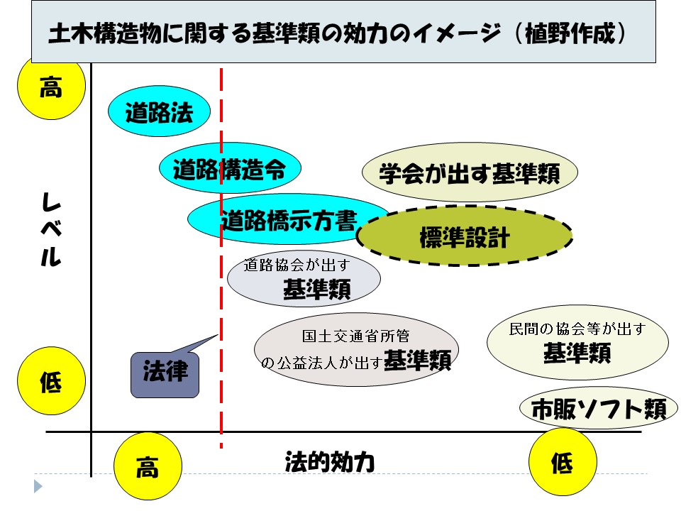 基準類や標準設計はツールであるはずのものである。基準や標準設計を勝手な解釈で、軽視した結果、設計ミスなどを会計検査で指摘されることとなる場合も有るが、なによりも、次工程に及ぼす影響が大きい。わが国では、厳格な積算基準と設計基準によって公共工事の品質が確保されているという現実がある。設計者の技術力そのものが設計手法やコストを決めていく物ではないという現実を認識しなければならない。市販の設計ソフトを活用し、設計業務を行い設計をしたつもりになっている。かつて、標準設計を否定した方々が居たが、将来を見通せない方々であるとしか思えない。たとえば、標準設計の1工種を作成するのに、我々は、数万ケースの試設計を行い、最適解を求めているのはご存知だろうか?其れを話すと、まともな技術者は「知らなかった。そこまでやっているんだ」と成るが、分からない人間には分からない。安易にデザインがどうのとか、画一的設計になるということで否定してしまっているが、他の分野の状態を見てみただけでもよく分かる。