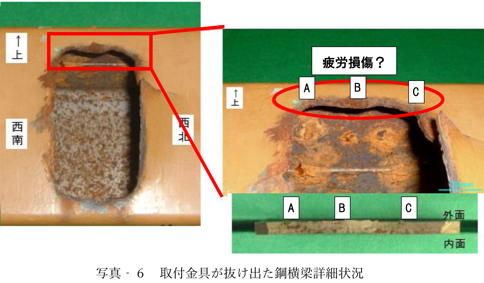 今回破壊したロープ取付部は、写真‐2の左側に一部映っている木製の門型支柱それぞれに固定されているロープ両端の取付部のうち、鋼製ロープカバー金具(写真‐3参照)が取り付けられた側である。取付金具は、すみ肉溶接により鋼横梁に取付けられており、破断面を調査すると鋼横梁側の溶接止端に沿って亀裂が進展し、最終的に破断したものと考えられる。未破壊側のロープ取付金具の状況を写真‐3 に示したが、取付方法は破断した側と同様に、鋼鉄製の金具がすみ肉溶接によって鋼横梁平面部に取付けられている。破壊した側と破壊しなかった側の差異は、ロープ取付金具の有無である。また、抜け出るように破壊した取付金具の側面側には、横梁軸方向に数か所の亀裂が確認されただけでなく、写真‐5で明らかなように引きちぎったような傷跡の残る鋼横梁の変形も確認できた。