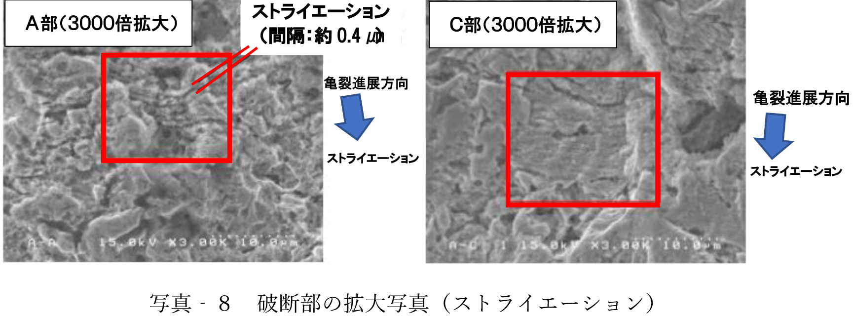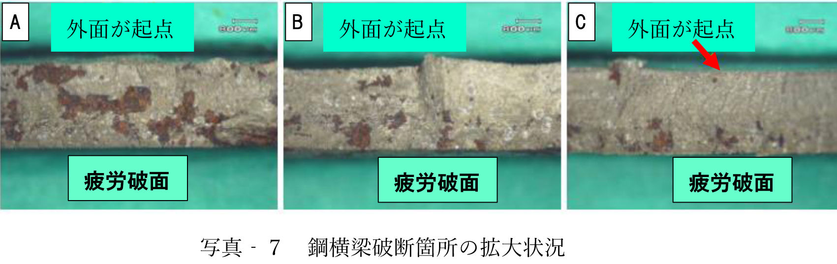 トマークやビーチマークが見られ、鋼材破断面が疲労破面であることが見て取れた。次に破断した部分の走査型電子顕微鏡(SEM)による拡大写真である写真‐8を見てほしい。A、B、C部いずれも外面側が破断起点の可能性が高いと予想したが、腐食が著しく破面の形態を確認することができなかった。破面全体的に言えることは、平滑な破面であり、部分的に疲労損傷の特徴と言えるストライエーション縞模様が見られ、破断の原因が疲労であると判断される。また、ストライエーションの方向から、疲労亀裂は外面から内面に向かって進行したと考えられ、ストライエーションの間隔が約0.4μmであることから、同速度で進行したとの条件下ではあるが約8,000回(3.2mm/0.4μm)の繰り返し変形で板厚を亀裂が貫通したと想定できる。以上が、鋼横梁取付金具取付箇所の破面調査結果である。次に、先にも話したように、破壊形態や使用後5年の短期間で破壊した等から材料的な不良によるとも考えられたので確認試験を行った。