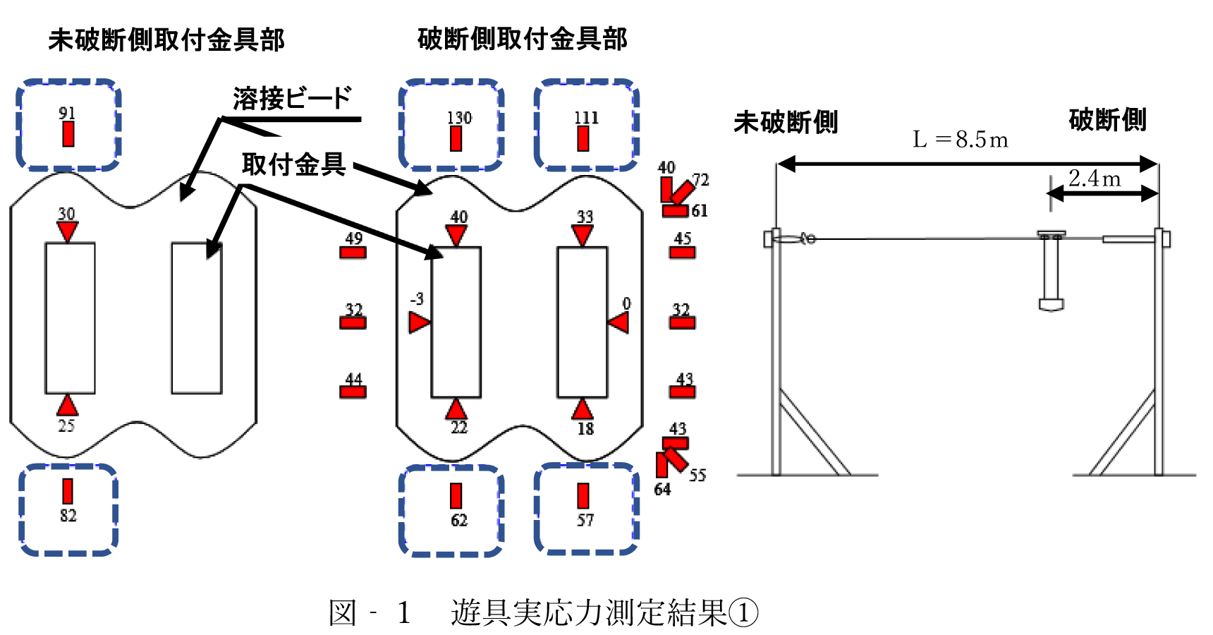 先も示したが鋼横梁の破断破面を調べた結果から、取付金具は疲労によって破壊に至った可能性が極めて高く、問題の疲労亀裂起点は取付金具を鋼横梁に溶接している上下端の溶接止端部と推定した。そこで、子供が乗った吊り篭がどの位置にあると、どのような応力値となり、それが疲労損傷発生応力となるかの検証実験も併せて行ってみた。図‐1が破断した側から2.4mに吊り篭が位置した状態、図‐2は中央部に位置した状態、今回は省略するが逆に未破壊側から2.1mに位置した状態において応力値計測を行った。その結果、図‐1に示す状態において取付金具上部溶接ビード近傍の応力値は最大130Mpaとなっていた。ここに図を2つ掲載したが、荷重の載荷位置によって応力値の差異はあるものの全般的に取付金具を溶接しているビード上部に高い応力が発生していることが明らかで、溶接ビード上部に繰り返し滑り変形が蓄積、発生した疲労亀裂の起点から亀裂が伝播、進展して破壊に至ったものと判断した。以上が、遊具取付部を破壊に至らせた疲労亀裂の発生、進展過程の説明である。