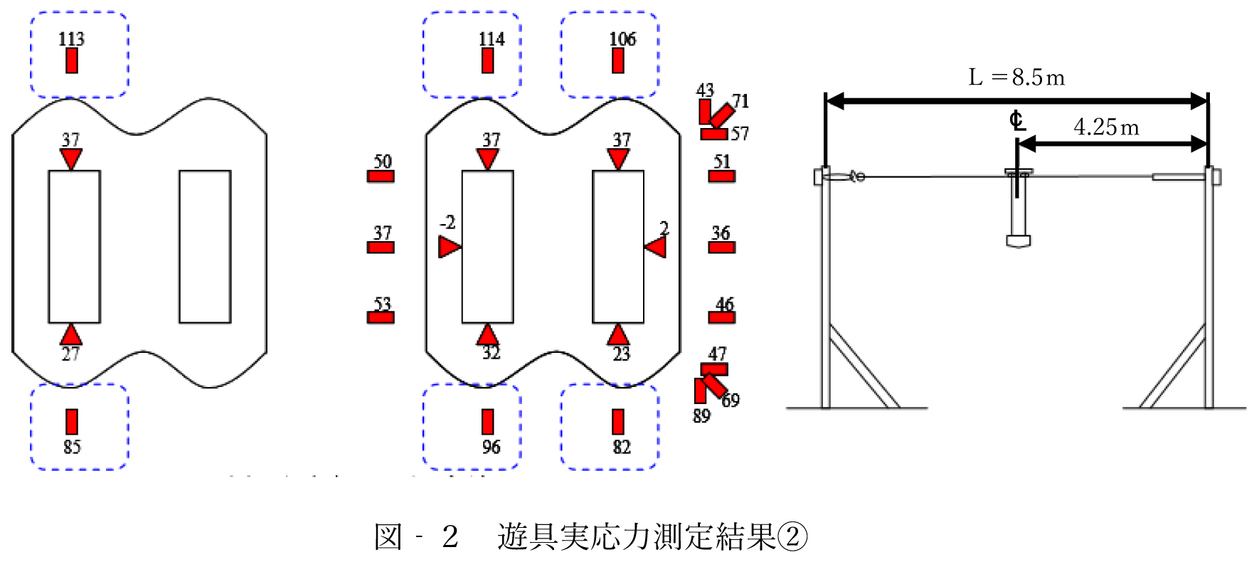 子供が乗った吊り篭に発生する静的なロープ張力に対し、遊具を構成する鋼横梁及び木製支柱に十分な耐力があるのかを検証することとした。検証内容は、子供3人が吊り篭に乗ってロープ中央に位置した時に作用するロープ張力を計算し、張力によって発生する横梁及び支柱各部の曲げ応力を算出することで鋼横梁の降伏応力と対比し、構造安全性を確認することとした。