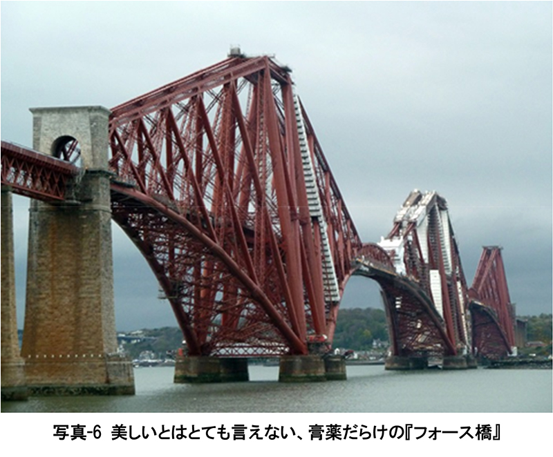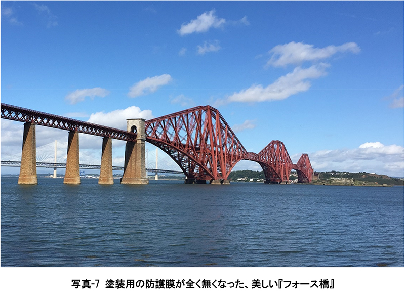 ここに示す複雑で手間のかかる塗り替え工事は、53,000イギリスガロン(240,000リットル)の塗料を投入、現地で塗布され、2011年12月に『フォース橋』本橋部の作業を終えた。私も『フォース橋』に行くたびに、写真‐6に示すような膏薬だらけの外観を見て、終わりのない塗り替え作業を永遠と続けているのかとがっかりして帰国していたが、実は違っていた。彼らも腐食との戦いに終止符を打つ新たな手を、それも米国企業の手を借りて行っていたとのことだ。これで、写真‐7でお分かりのように美しい無傷の『フォース橋』をしばらくは見ることが可能だ。新たな塗り替え作業で得られた塗膜の耐久性は、概ね20年から25年とのことであることから、2030年代の半ばにはまた新たな防食作業、塗り替え作業を行う可能性は高い。
