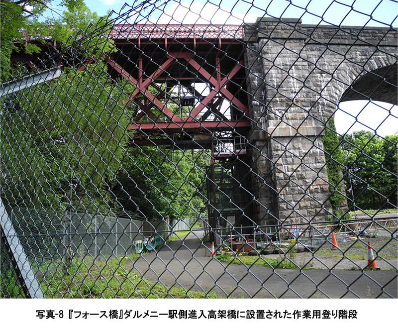 世界遺産『フォース橋』のメンテナンスがこれで終わったわけではない。それではどのような作業を行っているのかと言うと、当然、先に示した点検足場を使った点検・診断および必要な措置を写真‐8に示すダルメニー駅側進入高架橋に設置してある登り階段を起点に行っている。現在は、『フォース橋』から進入高架橋に重点を移して種々な作業を行っているようだが、写真-9に示すように取付部の格点を含む補修を作業員(写真‐10参照)が行き来しながら連日行っている。ここでも、先に示したテイブリッジと同様な、日々構造物を注意深く見守る『橋守』精神が感じられる。