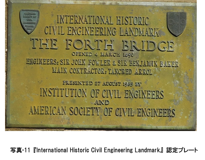 技術者の不断の努力が実り、その成果として、1985年8月27日に『 International Historic Civil Engineering Landmark 』として認定を受け(写真-11参照)、その30年後に橋単独としては数少ない貴重な世界遺産となったのだから素晴らしい。やはりここでも『ローマは一日にしてならず』なのだ。皆さん理解できますか? イギリス人、スッコトランド人魂と関係する技術者のプライドが。