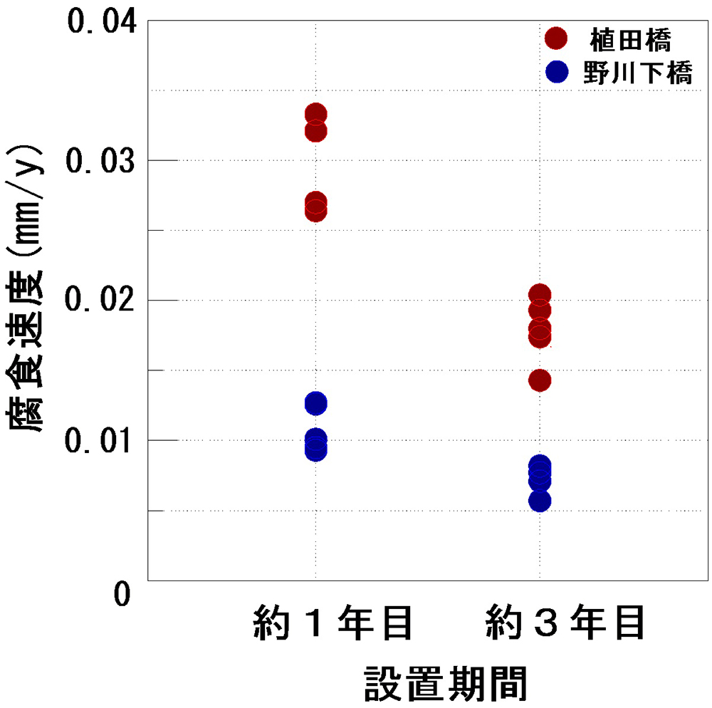 (右)図-4 普通鋼と耐候性鋼の腐食減少量の比較 ※2017年度鋼構造年次論文報告集投稿中