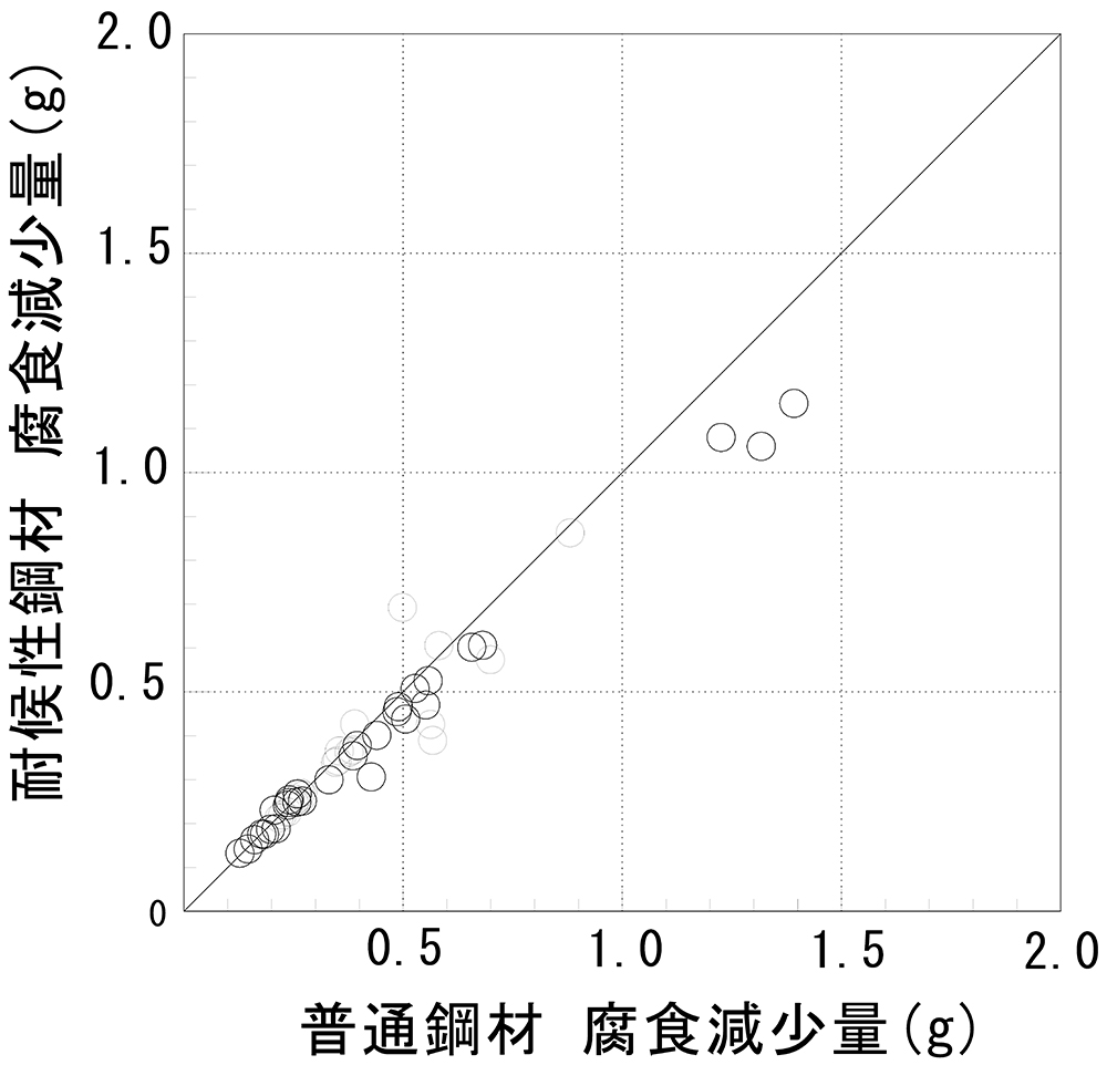 結果から腐食減少量が大きくなるに従い、普通鋼より耐候性鋼の腐食減少量がやや小さくなるが、それほど変わらないことがわかる。これらの結果は、もちろん暴露試験を実施している既往の文献には記載されているが、一般的な情報等から私か想像していた結果とは大きく異なっていた。