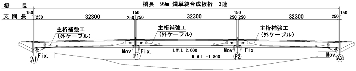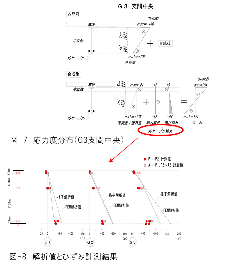 2つめは、②の「補強設計の方法」についてである。ここでも評価方法までの詳細な記載は省略するが、外ケーブル緊張力の設計に用いた格子解析およびFEM解析値と緊張時に行った現地計測値の差異について記載する。