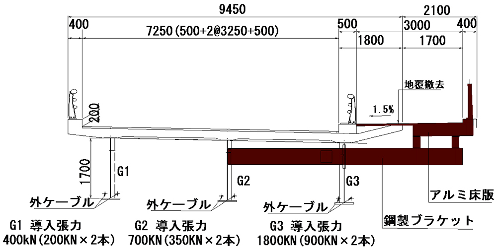 歩道拡幅にともなう荷重増加のため、外ケーブルによる補強の実施時の計測事例である。対象橋梁は単純鋼合成桁(図-5、写真-9)で外ケーブルの緊張により軸力と偏心曲げモーメントが導入される。歩道を片側のみ拡幅している(図-6、写真-10)ためG1からG3の緊張力を変えている。そのためケーブル緊張力を決定に用いた格子解析のほか、床版や外ケーブル定着部に対する局部的応力に対する検討も行うため、全橋をモデル化した線形FEM解析も行っている。