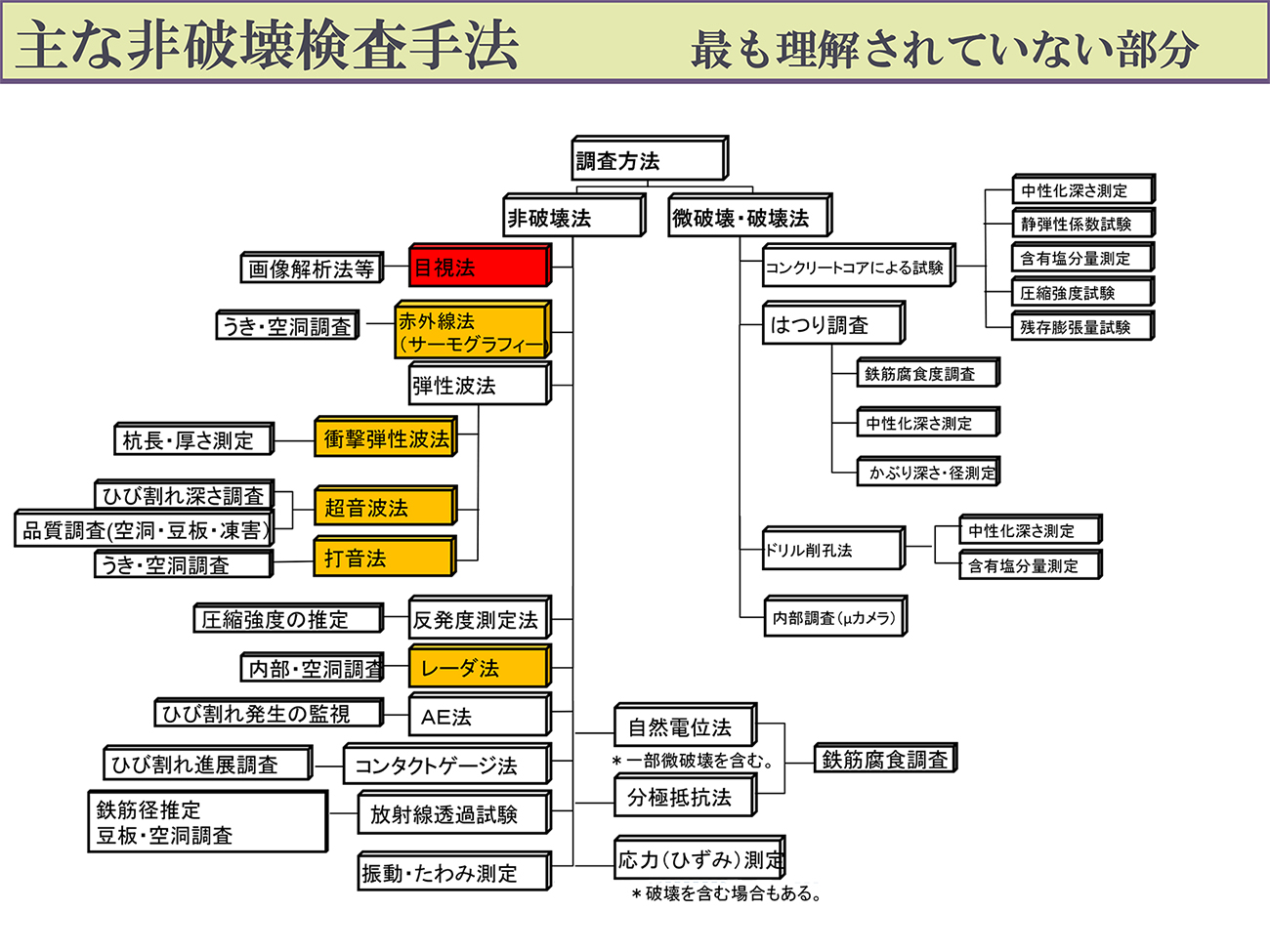 では、非破壊検査技術を活用するにはどうしたらよいか? 非破壊検査技術は、多種多様な物があり、診られるものが違う。まずこれを理解すべきである。