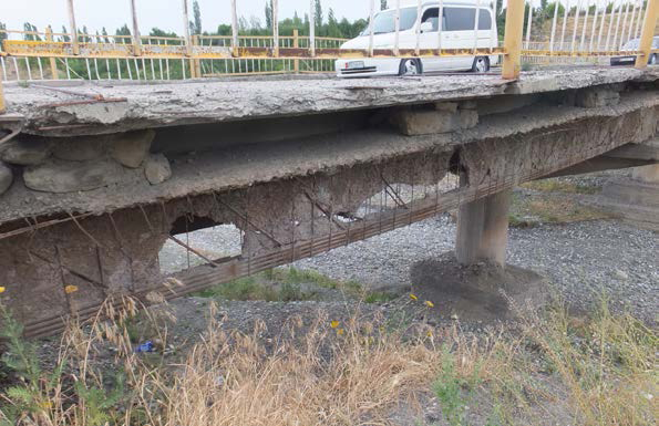 1991年の独立までは、ソ連の技術者により橋梁やトンネルなど構造物の維持管理が行われていたとのことであるが、ソ連の技術者も引き上げてしまい、現在ではほとんど技術者がいない状況で、独立から現在までの25年余り、ほとんど手つかずに近い状況である。(道路管理者総勢、約940人で地方道も含めた18,600kmを担当している。)また、橋梁台帳もあまり整備されておらず、事実、橋梁数も1,097橋とされていたが我々のチームで現地確認したところ、860橋ほどであった。橋梁台帳があったとしても、橋長や幅員が実際と大幅に違っているなどは決して珍しくはない。