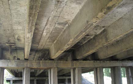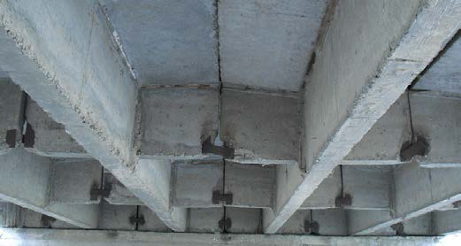 RC橋は床版橋と工場製作のプレキャストT桁がほとんどで、T桁は横桁ありのタイプ(写真‐7)および横桁なしのタイプ(写真-8)の2種類が使われている。横桁の連結は、写真のように小さなプレート金具のみとなっており、すでにそのほとんどが変形したり破断しており、荷重分配に問題がある。