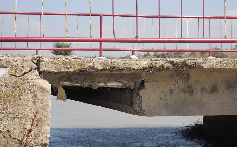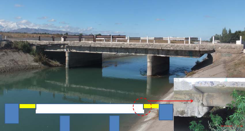 キルギスでは、水資源が豊富であり、広大な平原に立派な灌漑用水路が張り巡らされている。ただ、そこに架かっている橋梁が問題である。写真‐9のタイプの橋梁が用水路に架かる橋梁の標準となっている。形式は桁高60cm程度のRCスラブ橋であるが、橋台の手前2mほどは厚さ20cmのコンクリート版を主版の切欠きに載せた構造となっている。写真のように版の掛長はほとんどなく“危険な”状況である。