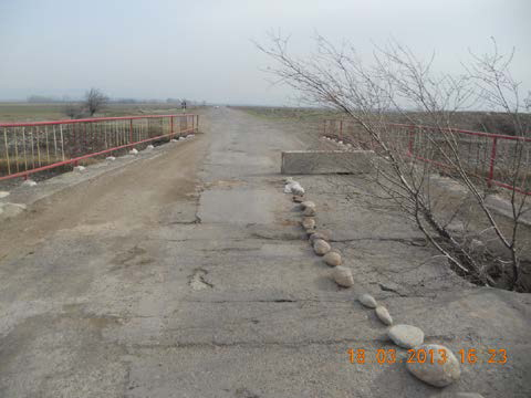 今はまだ大型車の通行が少ないので、落橋した例はないようであるが、桁端部の薄い版が壊れ橋面に穴がよく開くようである。補修までの間、陥没穴が目立つように枝の付いた大きな木を差し込んで、周りに石やコンクリートブロックを並べて“交通規制”を行っているが、何年もそのままで放置されることがほとんどである。(写真-11)